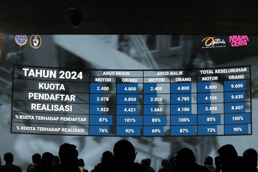 Lebih lanjut Capt. Antoni menjelaskan, untuk pelaksanaan Mudik Gratis Sepeda Motor dengan Kapal Laut Tahun 2024 rute Jakarta (Tanjung Priok) – Semarang (Tanjung Emas) dengan realisasi penumpang dari 4 call kapal sebanyak 8.663 orang atau 90.24 % dari kapasitas yang ditetapkan yaitu 9.600 orang dan untuk kendaraan bermotor sebanyak 3.488 unit atau 72.67 % dari kapasitas sebanyak 4.800 unit.