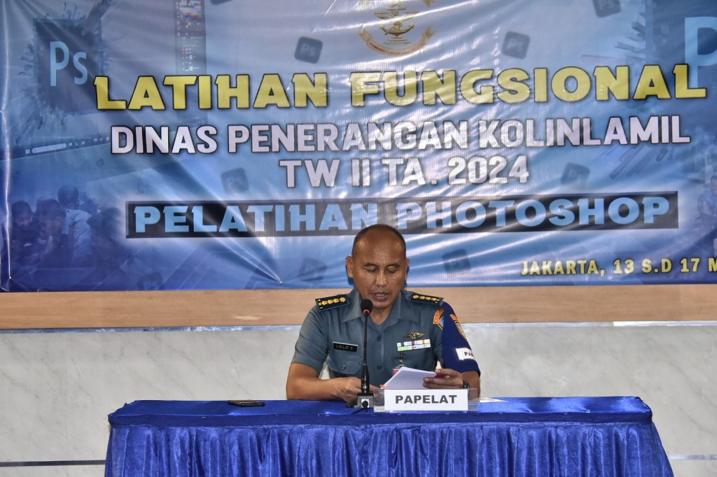 Dalam rangka menghasilkan Sumber Daya Manusia (SDM) yang profesional, kreatif dan inovatif di bidang aplikasi multimedia, TNI Angkatan Laut (TNI AL) dalam hal ini Dinas Penerangan Kolinlamil menggelar Latihan Fungsional (Latfungsi) Penerangan TW II Tahun 2024 yang dibuka secara langsung oleh Kadispen Kolinlamil Kolonel Laut (KH) Drs. Lie Lie Soeprijatna, M.M, bertempat di Gedung Laut Natuna Lantai 3, Mako Kolinlamil, Tanjung Priok, Jakarta Utara, Senin (13/5/2024). Dengan materi pelatihan yang diberikan adalah dasar-dasar Photoshop dan diikuti perwakilan prajurit dan PNS dari masing-masing Satuan Kerja Kolinlamil.