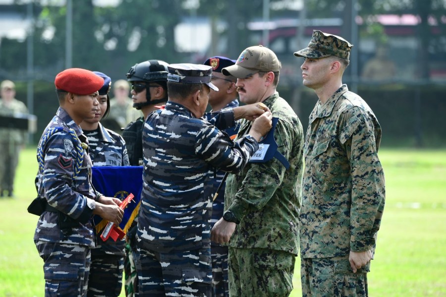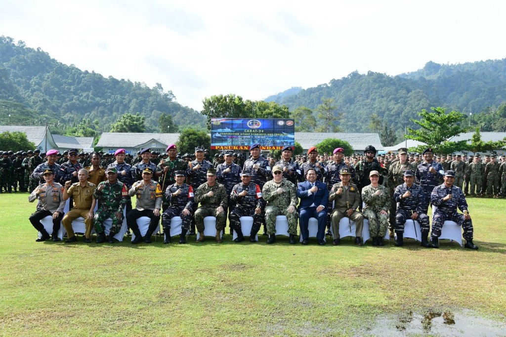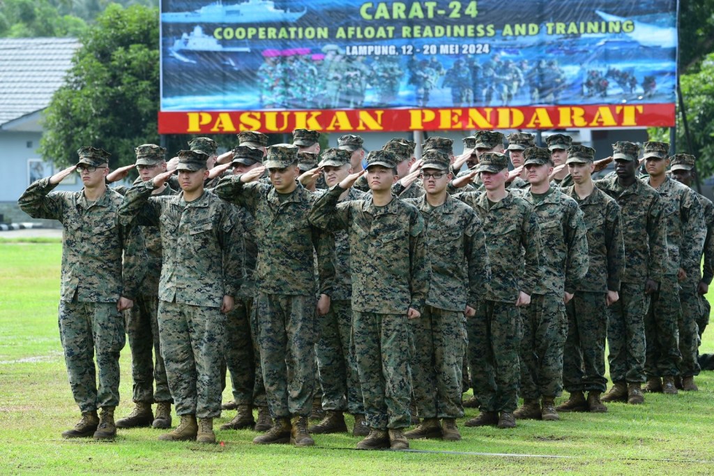 TNI Angkatan Laut (TNI AL) bersama US Navy dan USMC menggelar Latihan Bersama Cooperation Afloat Readiness And Training 2024 (Latma CARAT 2024) yang dibuka oleh Panglima Koarmada I Laksamana muda TNI Yoos Suryono Hadi dalam upacara militer di Batalyon Infanteri 9 Marinir, Piabung, Pesawaran Lampung, Senin (13/5/2024).