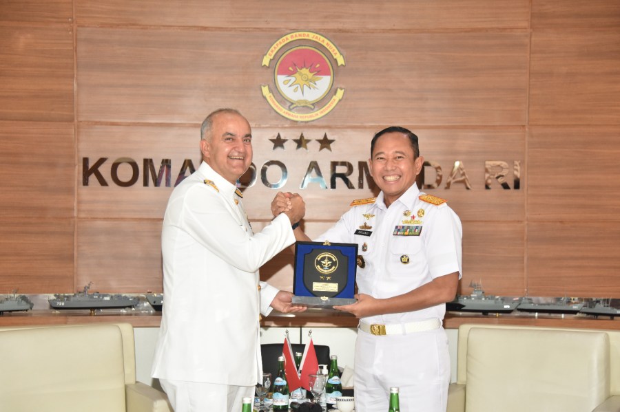 Panglima Kolinlamil Laksda TNI Hudiarto Krisno Utomo, PSC(j) M.A., M.M.S., CHRMP mendampingi Panglima Koarmada I Laksda TNI Dr. Yoos Suryono H, M.Tr.(Han)., M.Tr.Opsla., menerima kunjungan kehormatan Komandan Komando Wilayah Laut Utara Turki (Commander Of The Turkish Northern Sea Area Command) Rear Admiral (UH) Rafet Oktar menggunakan Kapal TCG Kinaliada (F-514), bertempat di Markas Komando Republik Indonesia, Jalan Gunung Sahari Jakarta Pusat, Jumat (17/5/2024).