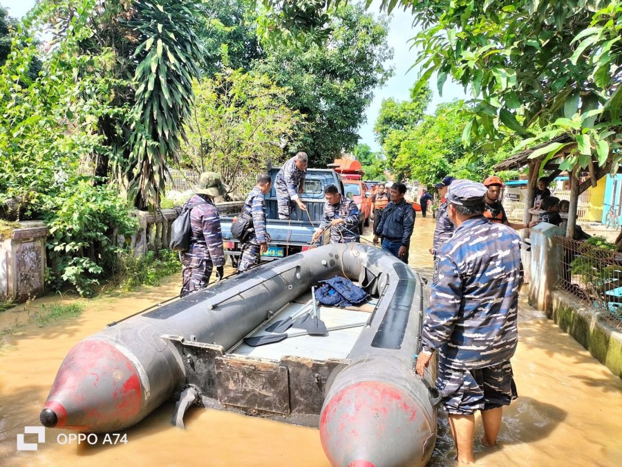 Sebanyak 16 orang personel Tim siaga banjir Lanal Cirebon yang dipimpin Dansatma Lanal Cirebon Kapten Marinir Maman Suratman beserta instansi dari BPBD, Basarnas dan Tagana, serta Dinkes Kabupaten Cirebon bergerak cepat memberikan bantuan dengan membagikan makanan kepada warga terdampak banjir dengan menggunakan 1 unit sekoci karet dan sejumlah peralatan keselamatan lainnya.