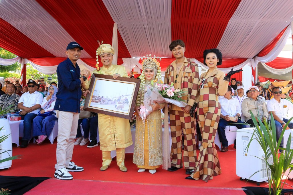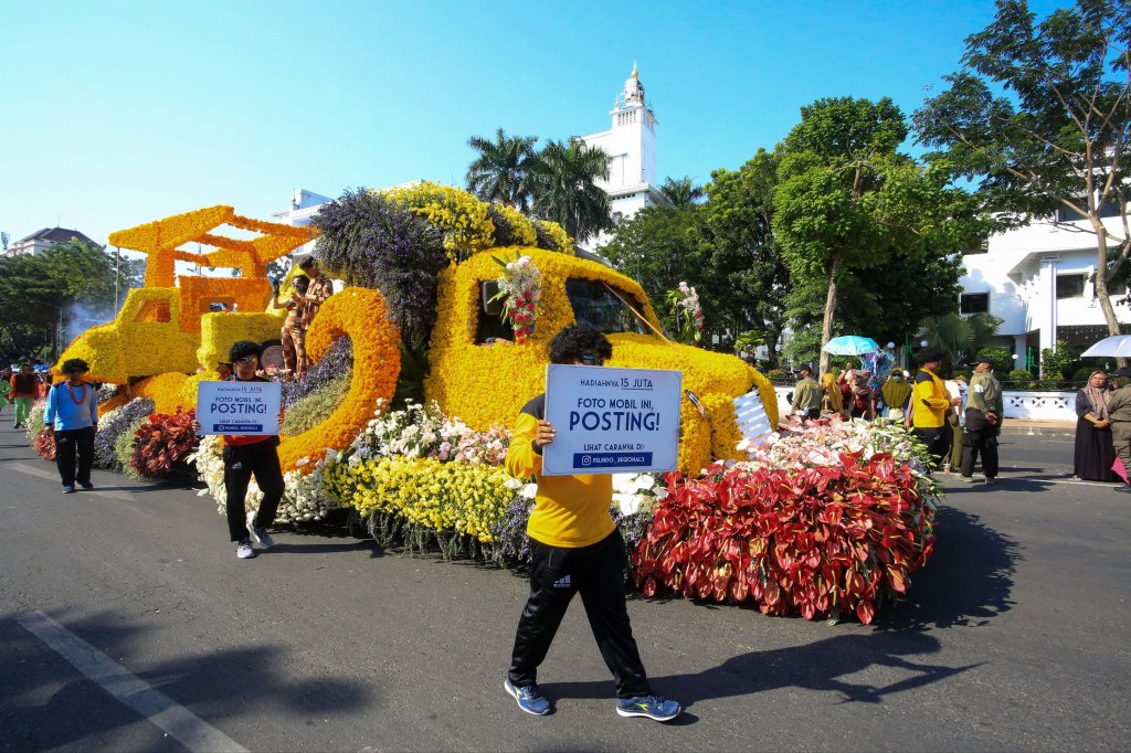 Kontingen BUMN PT Pelabuhan Indonesia (Persero) atau Pelindo angkut Jembatan Kuno Petekan dalam event Nasional tahunan, Parade Bunga dan Budaya Surabaya Vaganza 2024, hari ini Minggu (26/5/2024). Mobil hias dari Pelindo tampil mencolok dengan memamerkan miniatur Jembatan Kuno Petekan berbahan rangkaian bunga petik segar impor dan lokal, setinggi 4,4 meter.