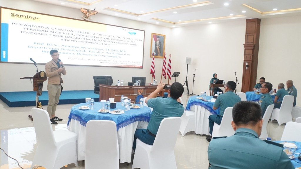 Selanjutnya, narasumber kedua oleh Guru Besar Oseanografi, Fakultas Perikanan dan Ilmu Kelautan Undip Prof. Dr. Sc. Anindya Wirasatriya dengan pembahasan tentang pemanfaatan upwelling ekstrem air laut dingin di perairan Alor Kecil, Kabupaten Alor, Provinsi Nusa Tenggara Timur dalam pengembangan ekonomi biru bidang pariwisata laut.(MM-01).
