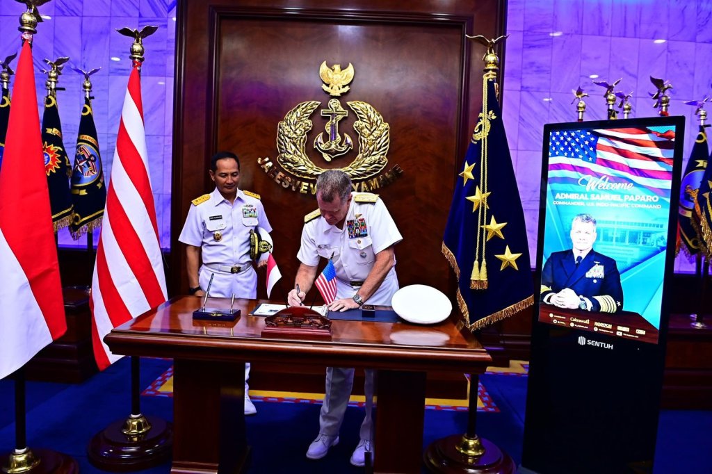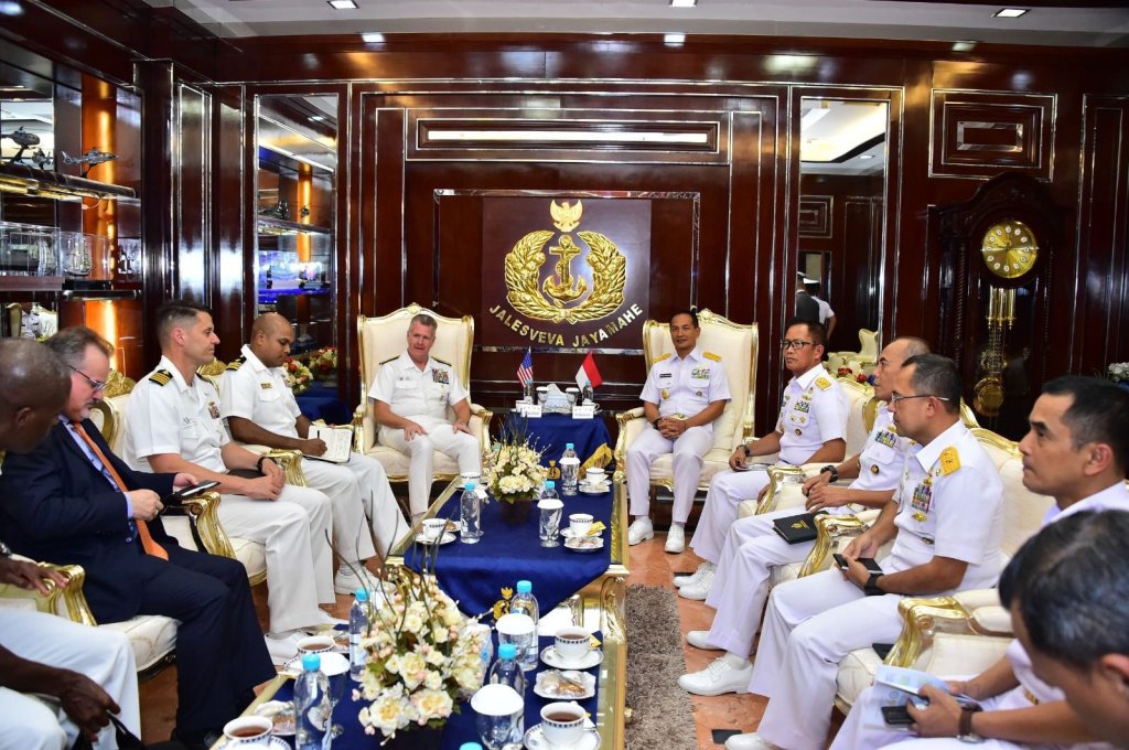 Wakil Kepala Staf Angkatan Laut (Wakasal) Laksamana Madya TNI Erwin S. Aldedharma mewakili Kepala Staf Angkatan Laut (Kasal) Laksamana TNI Dr. Muhammad Ali menerima kunjungan kehormatan Panglima Komando Indo-Pasifik Amerika Serikat atau US Indo – Pacific Command (INDOPACOM) Commander, Admiral Samuel J. Paparo di Ruang Admiral Markas Besar Angkatan Laut (Mabesal) Cilangkap, Jakarta Timur, hari ini, Kamis (13/6/2023).