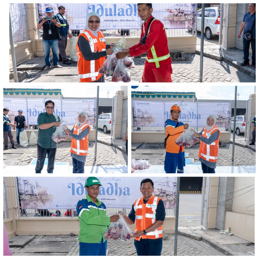 Merayakan Hari Raya Idul Adha 1445 Hijriah/2024 (Idul Qurban), PT Terminal Petikemas Surabaya (TPS) melaksanakan penyembelihan hewan kurban Sadan membagikan daging kurban kepada para mitra kerja yang sehari – hari mendukung kegiatan operasional perusahaan, di Surabaya, Senin (17/6/2024).