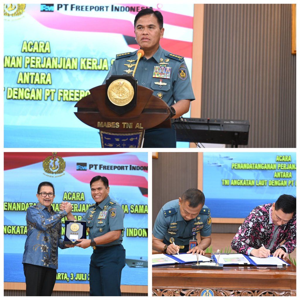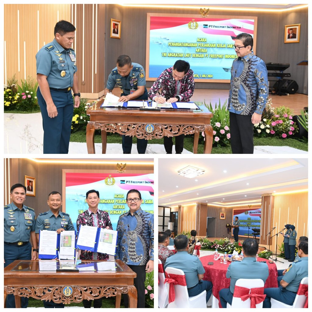 Dalam rangka mendukung program pemerintah menuju Indonesia Maju, TNI AL dengan PT. Freeport Indonesia (PTFI) melaksanakan Perjanjian Kerja Sama (PKS) Pembangunan dan Hibah Dermaga Pangkalan TNI AL (Lanal) Timika bertempat di Selasar Denma Mabesal, Cilangkap, Jakarta Timur, Rabu (3/7/2024).