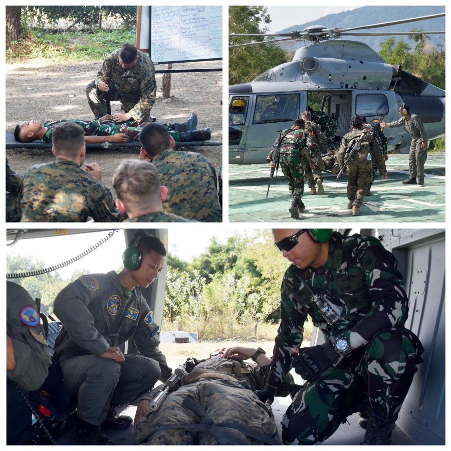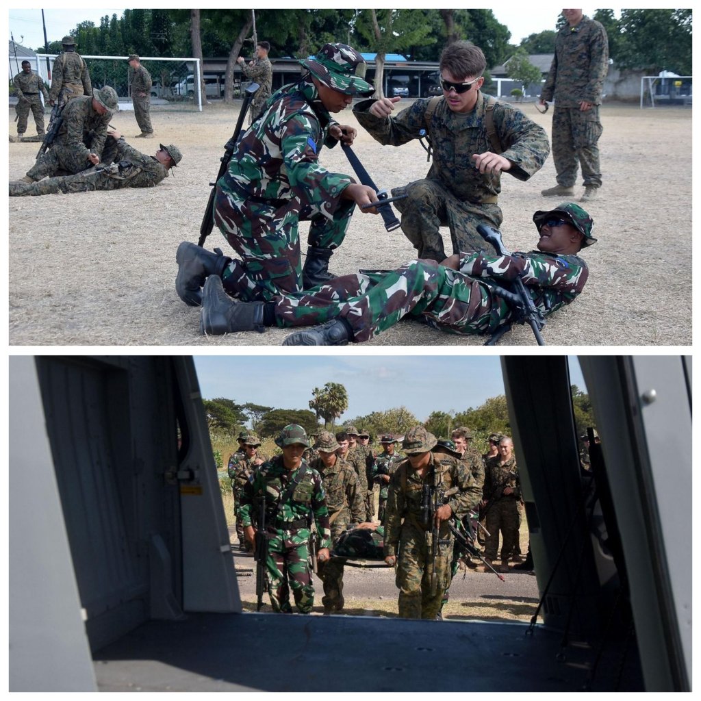 Latihan evakuasi medis udara tersebut diawali dengan pemberian materi pertolongan pertama pada korban tembak pada saat di medan pertempuran oleh dokter dari USMC Chief Aaron.