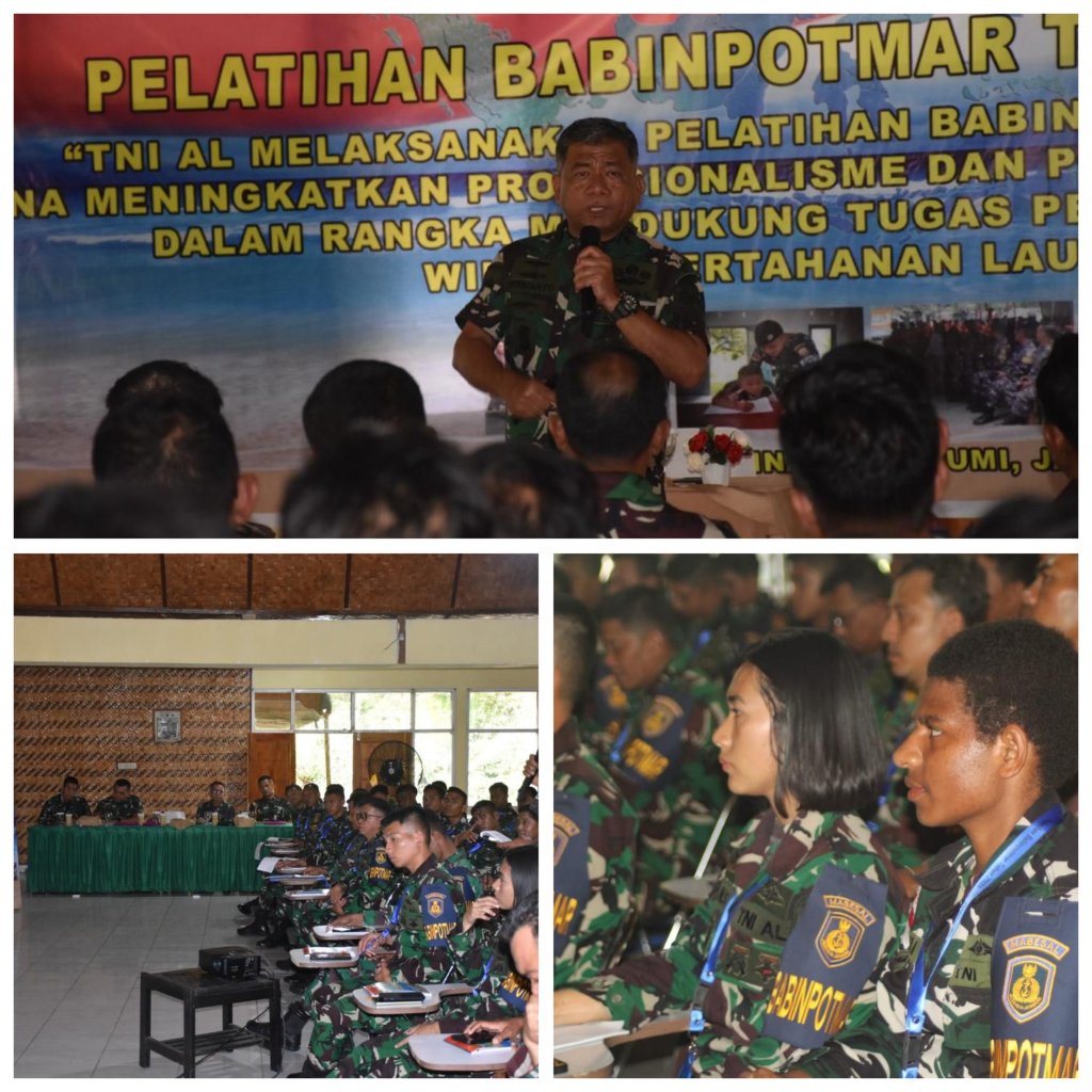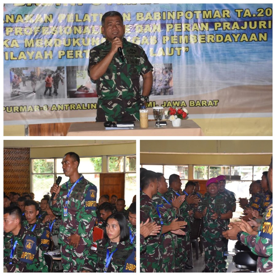 Asisten Potensi Maritim Kepala Staf Angkatan Laut (Aspotmar Kasal) Mayjen TNI Mar Dr. Hermanto melaksanakan peninjauan dan memberikan pembekalan kepada 150 orang siswa Susbabinpotmar di Puslatpur 6 Mar Antralina Sukabumi. Jumat (12/7/2024).