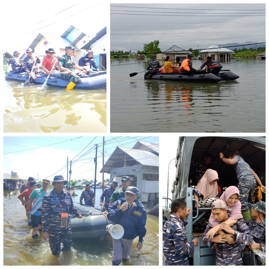 Dengan menggunakan perahu karet, Komandan Lanal Gorontalo Letkol Laut (P) Martha Novalianto, S.H., M.Tr.Opsla. mendampingi Bupati Kab. Gorontalo Prof. Dr. Ir. H. Nelson Pomalingo, M.Pd.,beserta Forkopimda Kab. Gorontalo melaksanakan peninjauan langsung ke wilayah terdampak banjir.