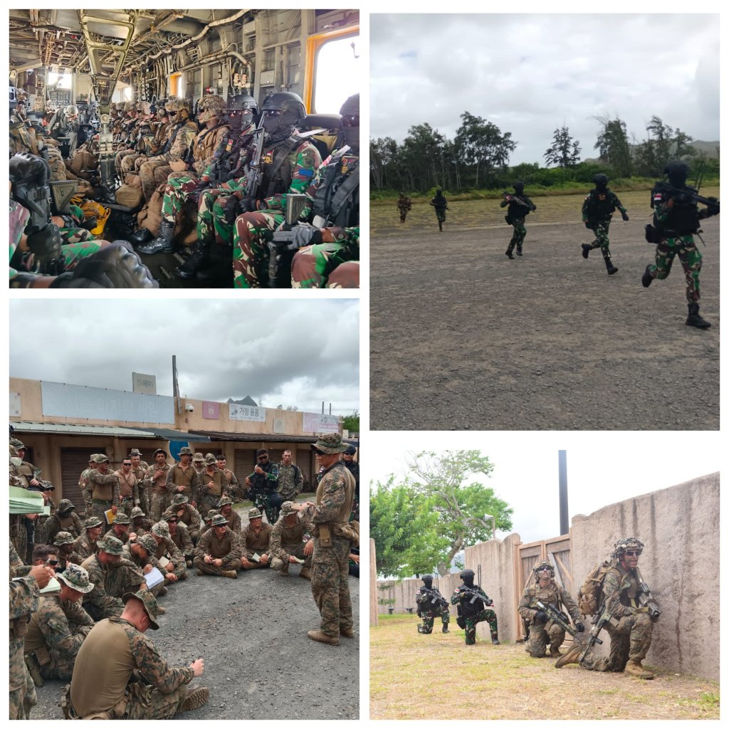 Korps Marinir TNI AL yang tergabung dalam Latihan Bersama (Latma) Multilateral Rim of The Pacific (Rimpac) 2024, melaksanakan latihan bersama pada tahap Force Integration Training (FIT) Phase, berkolaborasi dengan tiga negara diantaranya dari tuan rumah US Marines, Chile, dan Sri Lanka berhasil merebut dan menguasai Kota kecil yang berada di Marines Corps Training Area Bellows (MCTAB) Amerika Serikat, Sabtu (14/7/2024).