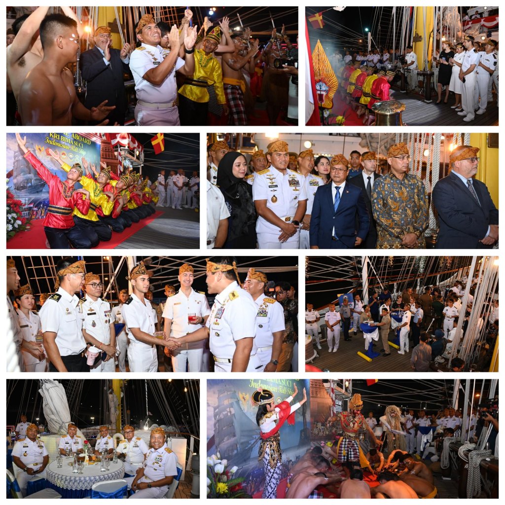 Guna meningkatkan hubungan diplomasi dengan negara sahabat, Kepala Staf Angkatan Laut (Kasal) Laksamana TNI Dr. Muhammad Ali didampingi Ketua Umum Jalasenastri Ny. Fera Muhammad Ali Pejabat Utama Mabesal dan Pejabat Wilayah Jakarta menghadiri Acara Cocktail Party bertempat di atas KRI Bima Suci yang saat ini tengah sandar di Dermaga Kolinlamil, Jakarta Utara Senin (5/8/2024).