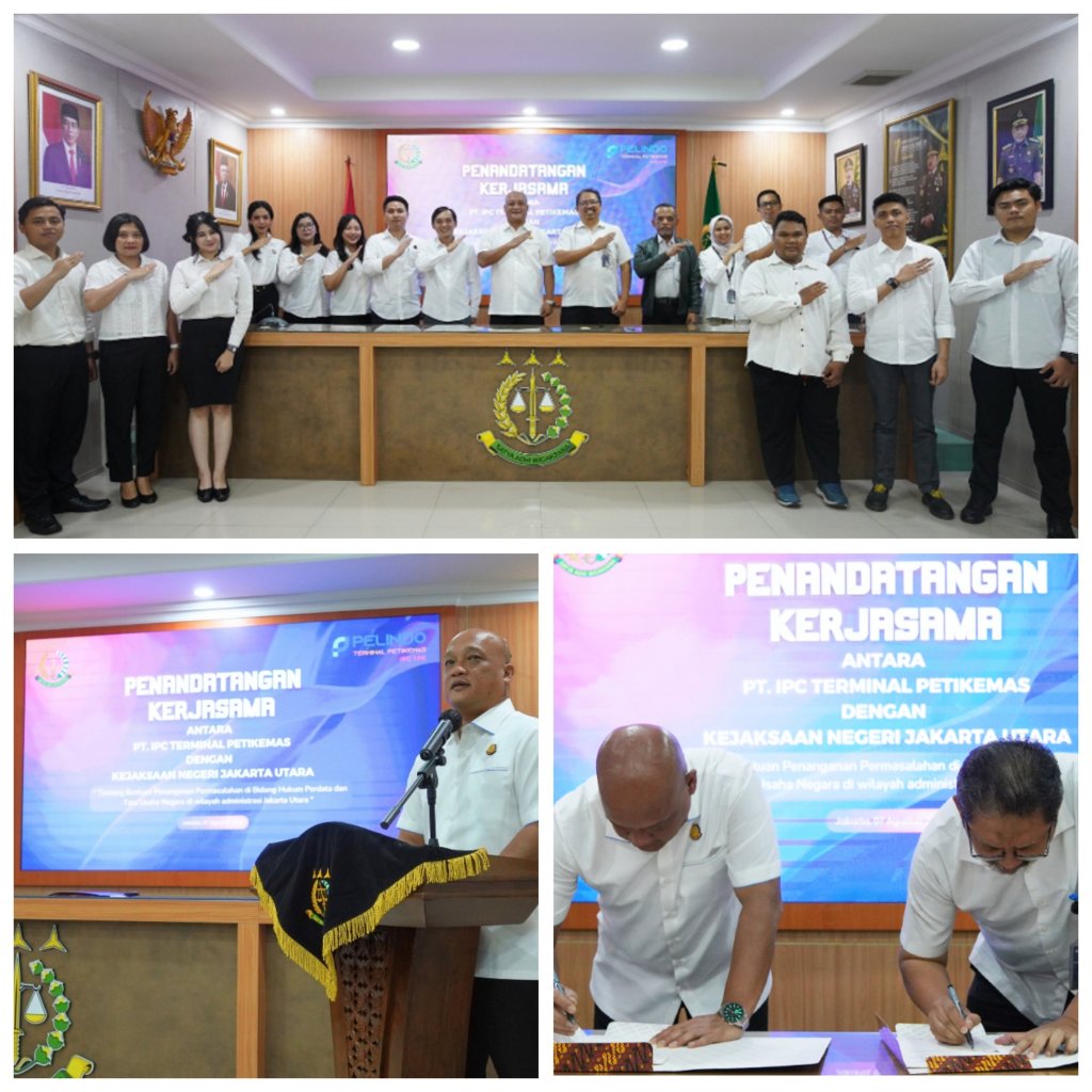 Manajemen IPC Terminal Petikemas melaksanakan menandatangani Kesepakatan Bersama dengan Kejaksaan Negeri Jakarta Utara terkait Bantuan Penanganan Permasalahan di Bidang Hukum Perdata dan Tata Usaha Negara bertempat di Kantor Kejaksaan Negeri Jakarta Utara, Jalan Enggano Kecamatan Tanjung Priok – Jakarta Utara, Rabu (7/8/2024).