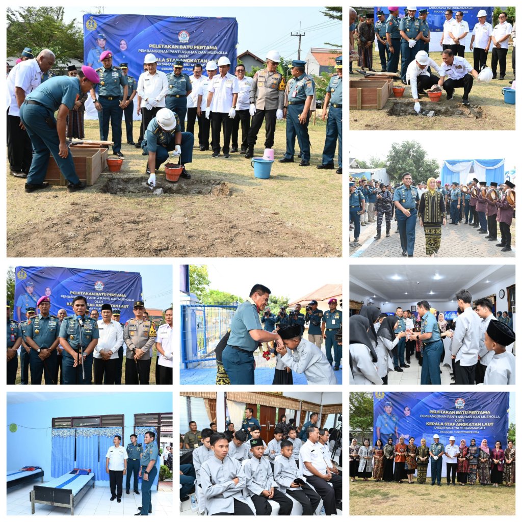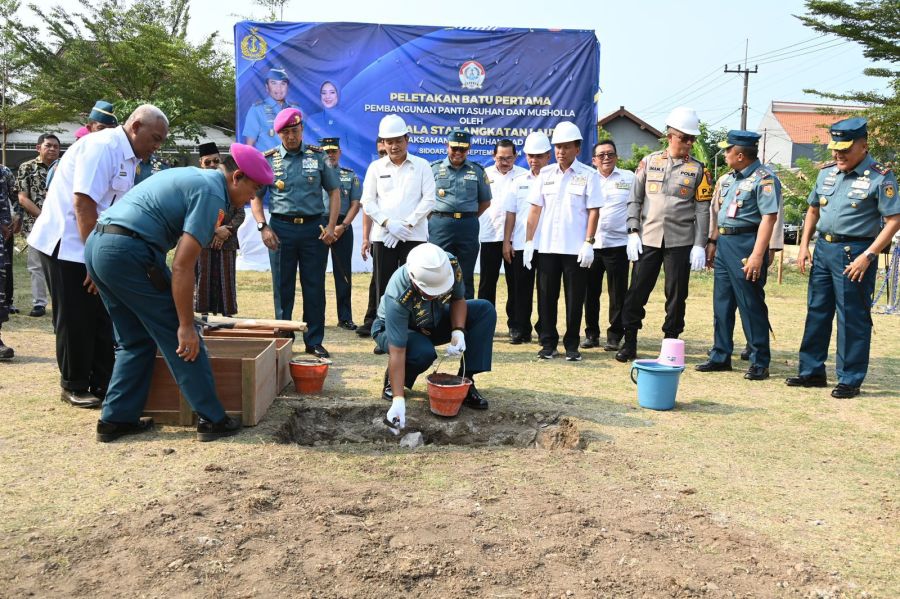 Kepala Staf Angkatan Laut (Kasal) Laksamana TNI Dr. Muhammad Ali didampingi Ketua Umum Jalasenastri Ny. Fera Muhammad Ali melaksanakan peletakan batu pertama pembangunan Panti Asuhan Yayasan Sosial Bhumyamca (Yasbhum) ke-3 dan Mushola di Komplek TNI AL Jala Griya, Candi Sidoarjo, Jawa Timur. Jumat (13/9/2024).