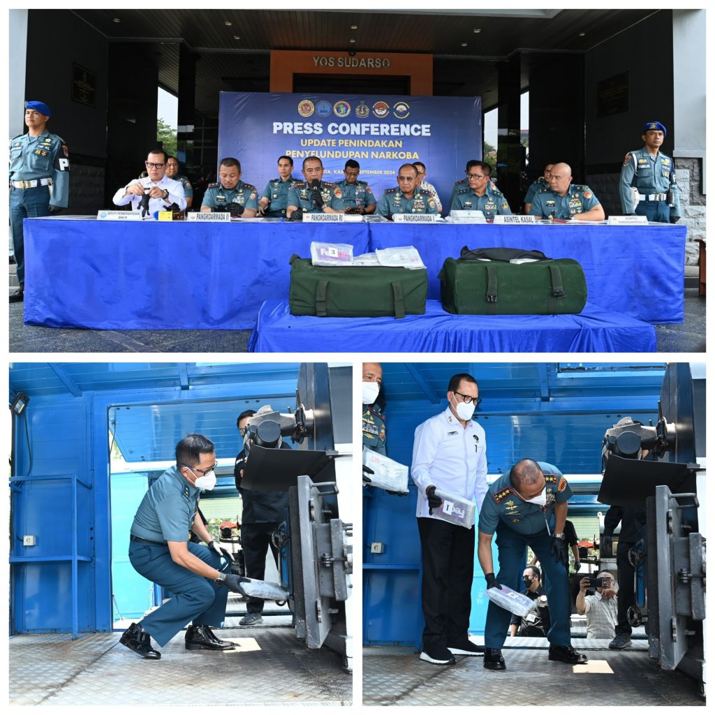 Demikian disampaikan Panglima Komando Armada RI (Pangkoarmada RI) Laksamana Madya TNI Denih Hendrata didampingi Asintel Kasal Laksda TNI Akmal, Pangkoarmada I Laksda TNI Yoos Suryono, Pangkoarmada II Laksda TNI Ariantyo Condrowibowo, Asintel Koarmada RI Laksma TNI Iwan dan Deputi Pemberantasan Narkoba BNN RI Irjen Pol I. W. Sugiri dihadapan awak media bertempat di Mako Koarmada RI, Gunung Sahari, Jakarta Pusat, Kamis (19/9/2024).