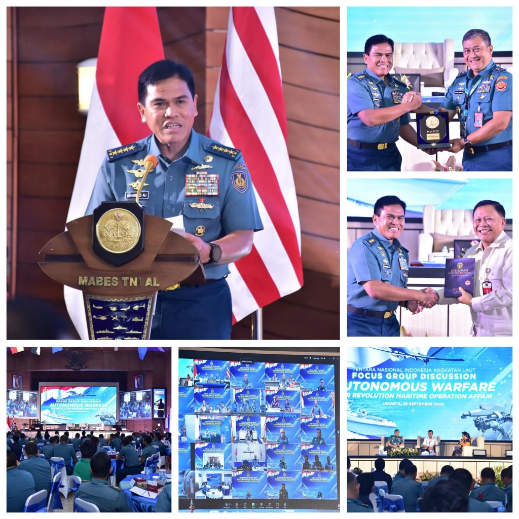 TNI AL berkomitmen dalam meningkatkan kepedulian terhadap perkembangan teknologi otonom saat ini, Kepala Staf Angkatan Laut (Kasal) Laksamana TNI Dr. Muhammad Ali membuka acara Focus Group Discussion (FGD) Autonomous Warfare For Revolution Maritime Operation Affair bertempat di Auditorium Denma Mabesal, Cilangkap, Jakarta Timur. Rabu (25/9/2024).
