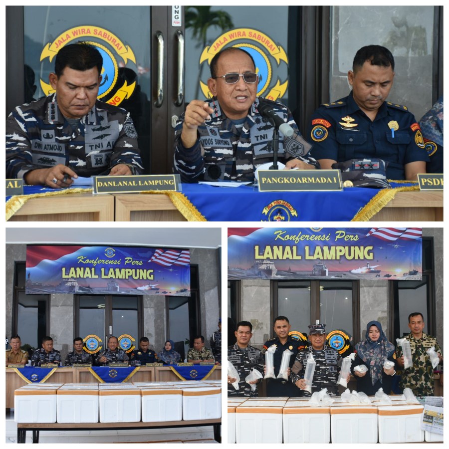 Turut hadir dalam konferensi pers tersebut Komandan Lantamal III Brigjen TNI Marinir Harry Indarto, S.E., M.M., Komandan Lanal Lampung, Kolonel Laut (P) Dwi Atmojo, dan Koordinator Satwas SDKP Pesawaran Ibu Emy Ramadhani, S.Pi.(MM/Dispenal).