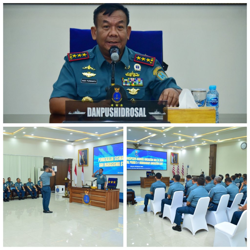 Komandan Pusat Hidro-Oseanografi TNI Angkatan Laut (Danpushidrosal) Laksamana Madya TNI Dr. Budi Purwanto, S.T., M.M. memberikan pembekalan kepada 15 orang Perwira Siswa (Pasis) Pendidikan Spesialisasi Perwira (Dikspespa) Hidros Angkatan XXII dan 10 orang Mahasiswa Sekolah Tinggi Teknologi Angkatan Laut (STTAL) Prodi S-1 Teknik Hidrografi Angkatan XLIV bertempat di Ruang Serbaguna Pushidrosal, Ancol, Jakarta Utara, Rabu (30/10/2024).