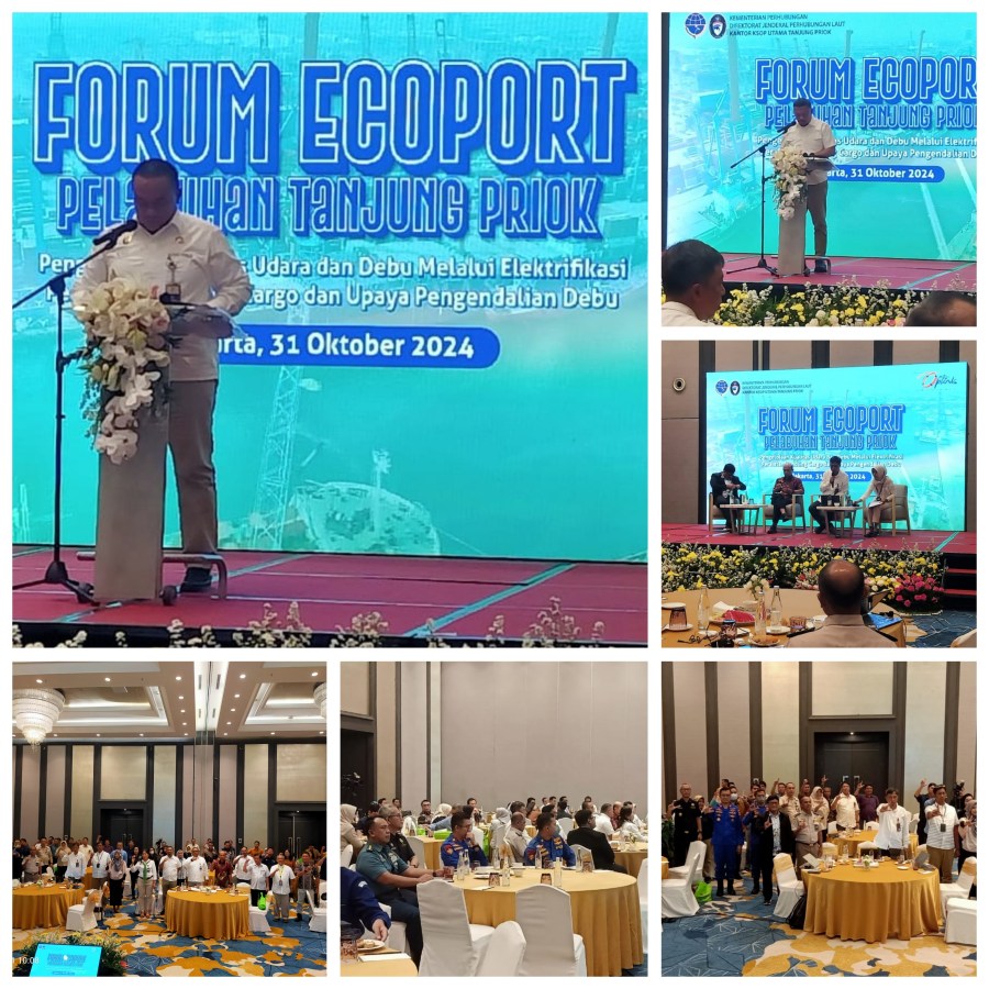 Kantor Kesyahbandaran dan Otoritas Pelabuhan Utama (KSOP) Tanjung Priok menyelenggarakan Kegiatan Acara Forum Eco Port Pelabuhan Tanjung Priok dengan tema “Pengelolaan Kualitas Udara dan Debu Elektrofikasi Peralatan Handling Cargo dan Upaya Pengendalian Debu” bertempat di Hotel Vertu Harmoni Jakarta Pusat, Kamis (31/10/2024).