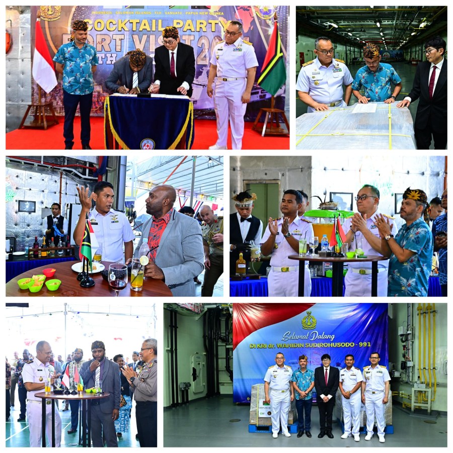 Satgas Port Visit 2024 menyelenggarakan National Reception yang dihadiri oleh Wakil Perdana Menteri Vanuatu Mr. Matai Seremaiah bertempat di Hanggar Heli KRI Wahidin Sudirohusodo-991 (KRI WSH-991) yang sandar di Port Vila, Negara Vanuatu. Sabtu (9/11/2024).