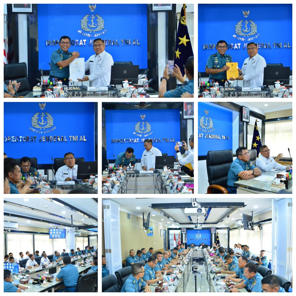 TNI AL bersama Badan Pemeriksa Keuangan Republik Indonesia (BPK RI) melaksanakan Taklimat Akhir Pemeriksaan Terinci Kinerja atas Efektivitas Tata Kelola dan Efisiensi Keuangan BLU, Pemeriksaan Kinerja atas Efektivitas Renalpalhankam yang dibiayai dari PLN/PDN serta Taklimat Awal Pemeriksaan Interim atas LK Kemhan TNI TA 2024 pada UO TNI AL bertempat di Ruang Rapat Itjenal, Mabesal, Cilangkap, Jakarta Timur. Senin (18/11/2024).