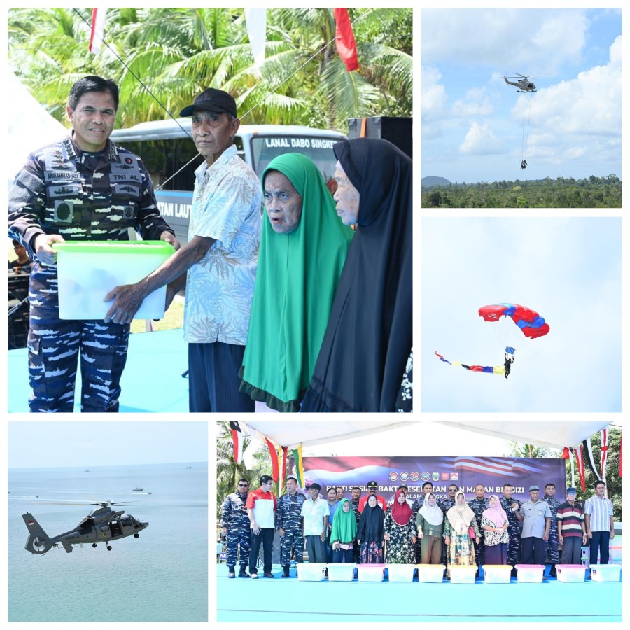 Usai pelaksanaan latihan, di wilayah Dabo Singkep Kepulauan Riau, TNI AL menggelar Bakti Sosial dengan membagikan paket bantuan sembako kepada 300 masyarakat pesisir, Bakti Kesehatan berupa pengobatan gratis dan khitan kepada 200 masyarakat, serta Makan Sehat Bergizi bersama dengan 500 siswa-siswi di wilayah Dabo Singkep.(MM/Dispenal).
