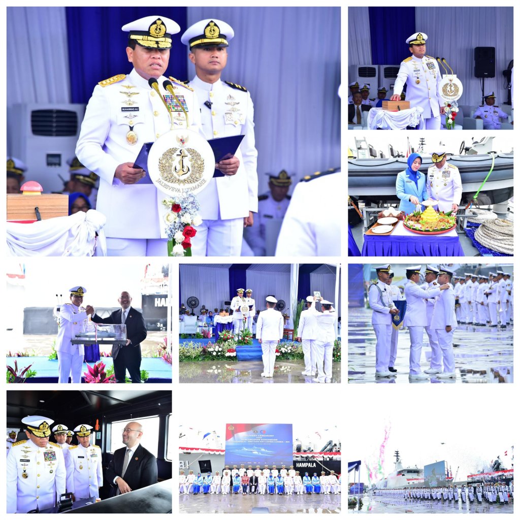 Kepala Staf Angkatan Laut (Kasal) Laksamana TNI Dr. Muhammad Ali didampingi Ketua Umum Jalasenastri Ny. Fera Muhammad Ali memimpin acara delivery dan upacara peresmian dua unit Kapal Perang PC 60 produksi dalam negeri dari Galangan PT. Caputra Mitra Sejati yaitu KRI Hampala-880 dan KRI Lumba-Lumba-881 di Dermaga KBT Sunda Kelapa, Jakarta Utara. Selasa (17/12/2024).