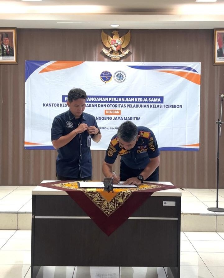 Kementerian Perhubungan Cq Direktorat Jenderal Perhubungan Laut melalui Kantor Kesyahbandaran dan Otoritas Pelabuhan (KSOP) Kelas II Cirebon bersama PT. Langgeng Jaya Maritim melakukan Penandatanganan Naskah Perjanjian Kerja Sama terkait Dokumen Identitas Pelaut bertempat di Aula Kantor KSOP Kelas II Cirebon, hari ini Selasa (11/3/2025).