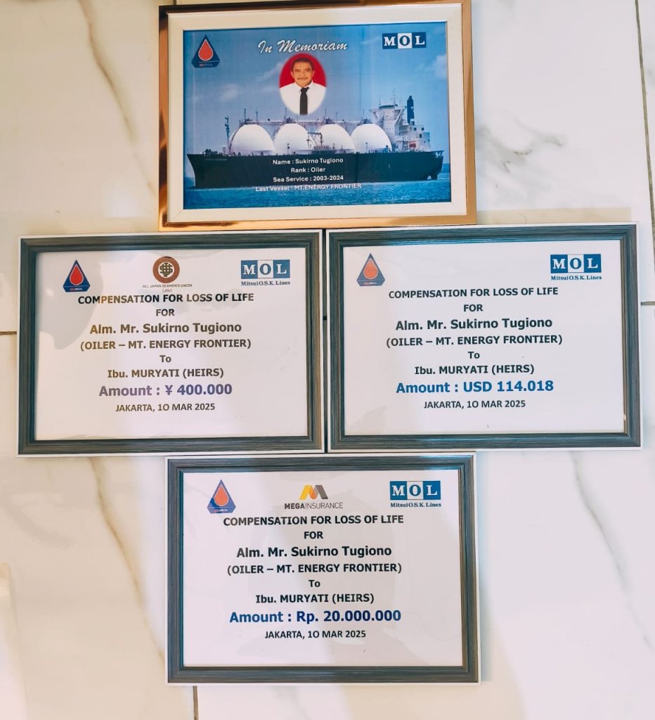 Kementerian Perhubungan Cq Direktorat Jenderal Perhubungan Laut melalui Direktorat Perkapalan dan Kepelautan kembali memfasilitasi penyerahan asuransi dan santunan oleh PT McMOL Crewing International kepada ahli waris pelaut Indonesia yang meninggal saat bertugas. Penyerahan asuransi dan santunan diberikan secara simbolis kepada keluarga Almarhum Sukirno Tugiono melalui ahli warisnya, yakni Muryati selaku istri sah di Kantor Kementerian Perhubungan, Jakarta, Senin (10/3/2025) lalu.