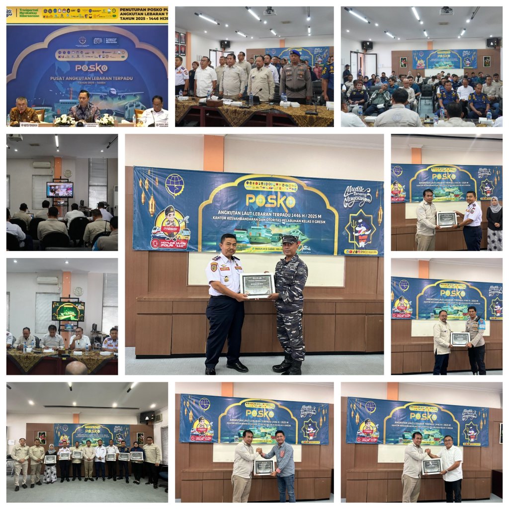 Acara penutupan Posko Angkutan Lebaran (Angleb) 2025, hari ini, Sabtu, (12/4/2025), telah resmi ditutup oleh Menteri Perhubungan Dudy Purwagandhi, Menteri Koordinator Bidang Infrastruktur dan Pembangunan Kewilayahan Dr.Agus Harimurti Yudhoyono,M.SC, M.P.A, M.A., Wakil Menteri Perhubungan Komjen.Pol (Purn) Drs.Suntana,M.Si secara daring yang dihadiri oleh Kementerian/Lembaga/Instansi terkait para Kepala Unit Pelaksana Teknis (UPT) Kementerian Perhubungan dan diikuti oleh Kesyahbandaran dan Otoritas Pelabuhan (KSOP)Kelas II Gresik, Dinas Perhubungan Kab Gresik, KSOP Kelas II Tanjung Pakis, Pangkalan PLP Kelas II Tanjung Perak, General Manager (GM) Pelindo (Persero) Regional 3 Cabang Gresik, Kapolsek KPPP, Kaposkamladu Gresik bersama Petugas Posko Angkutan Lebaran Tahun 2025.