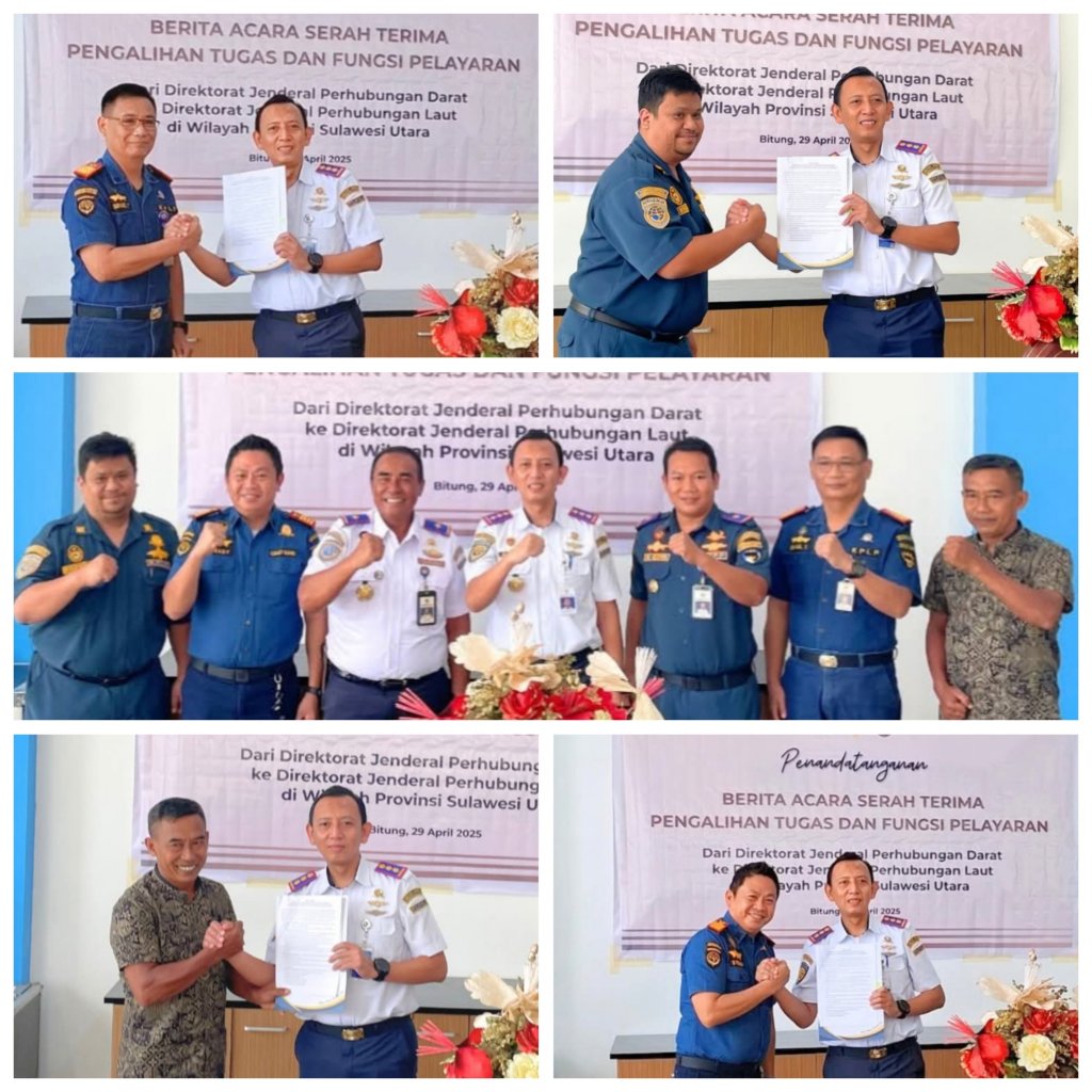Bertempat di Ruang Rapat Kantor Kesyahbandaran dan Otoritas Pelabuhan (KSOP) Kelas I Bitung, Selasa (29/4/2025) telah dilaksanakan penandatanganan berita acara serah terima Pengalihan Tugas dan Fungsi Pelayaran dari Direktorat Jenderal Perhubungan Darat (Ditjen HUBDAT) ke Direktorat Jenderal Perhubungan Laut (Ditjen HUBLA) di Pelabuhan Bitung Provinsi Sulawesi Utara.