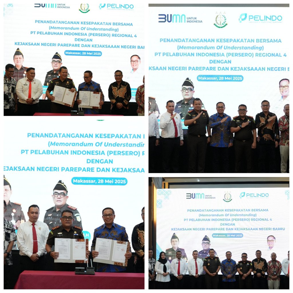 Sebagai bentuk komitmen dalam memperkuat tata kelola perusahaan yang baik atau GCG (Good Corporate Governance) serta menciptakan kepastian hukum dalam setiap aspek operasional, PT Pelabuhan Indonesia (Persero) Regional 4 melakukan penandatanganan Kesepakatan Bersama atau Memorandum of Understanding (MoU) dengan Kejaksaan Negeri Parepare dan Kejaksaan Negeri Barru, di Makassar Rabu (28/5/2025) kemarin.