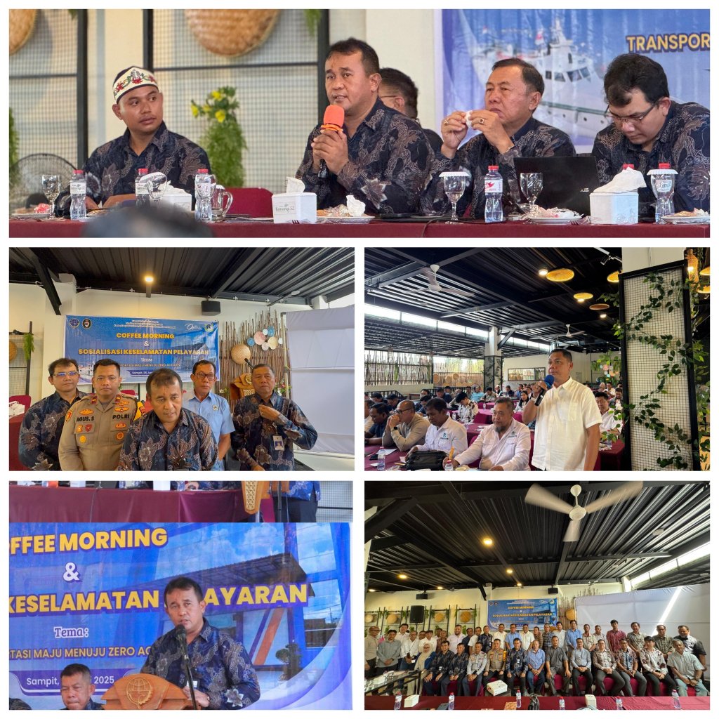 Kantor Kesyahbandaran dan Otoritas Pelabuhan (KSOP) Kelas III Sampit menyelenggarakan kegiatan Coffee Morning dan Sosialisasi Keselamatan Pelayaran bertema “Transportasi Maju Menuju Zero Accident.” Kegiatan ini menjadi wujud nyata komitmen KSOP Kelas III Sampit dalam membangun dan meningkatkan budaya keselamatan pelayaran yang kuat, humanis dan kolaboratif di wilayah kerja Pelabuhan Sampit.