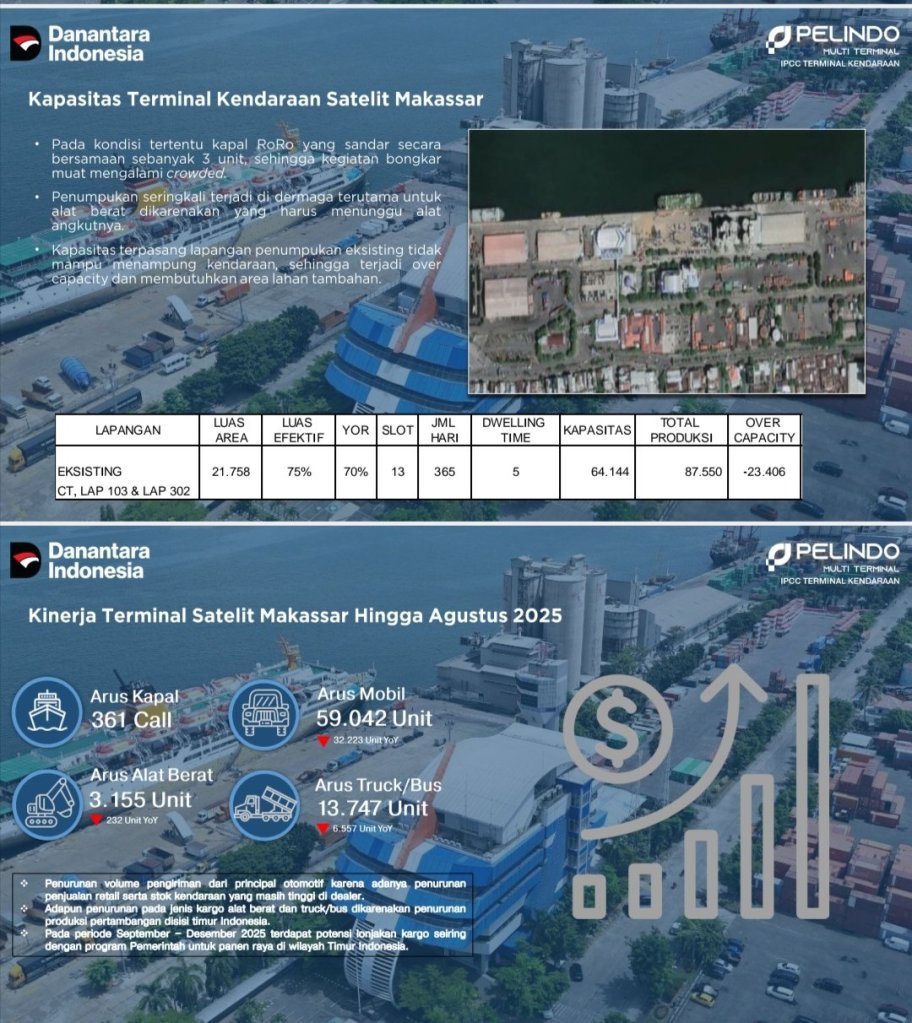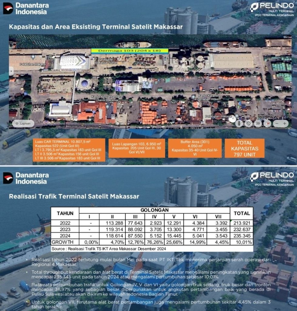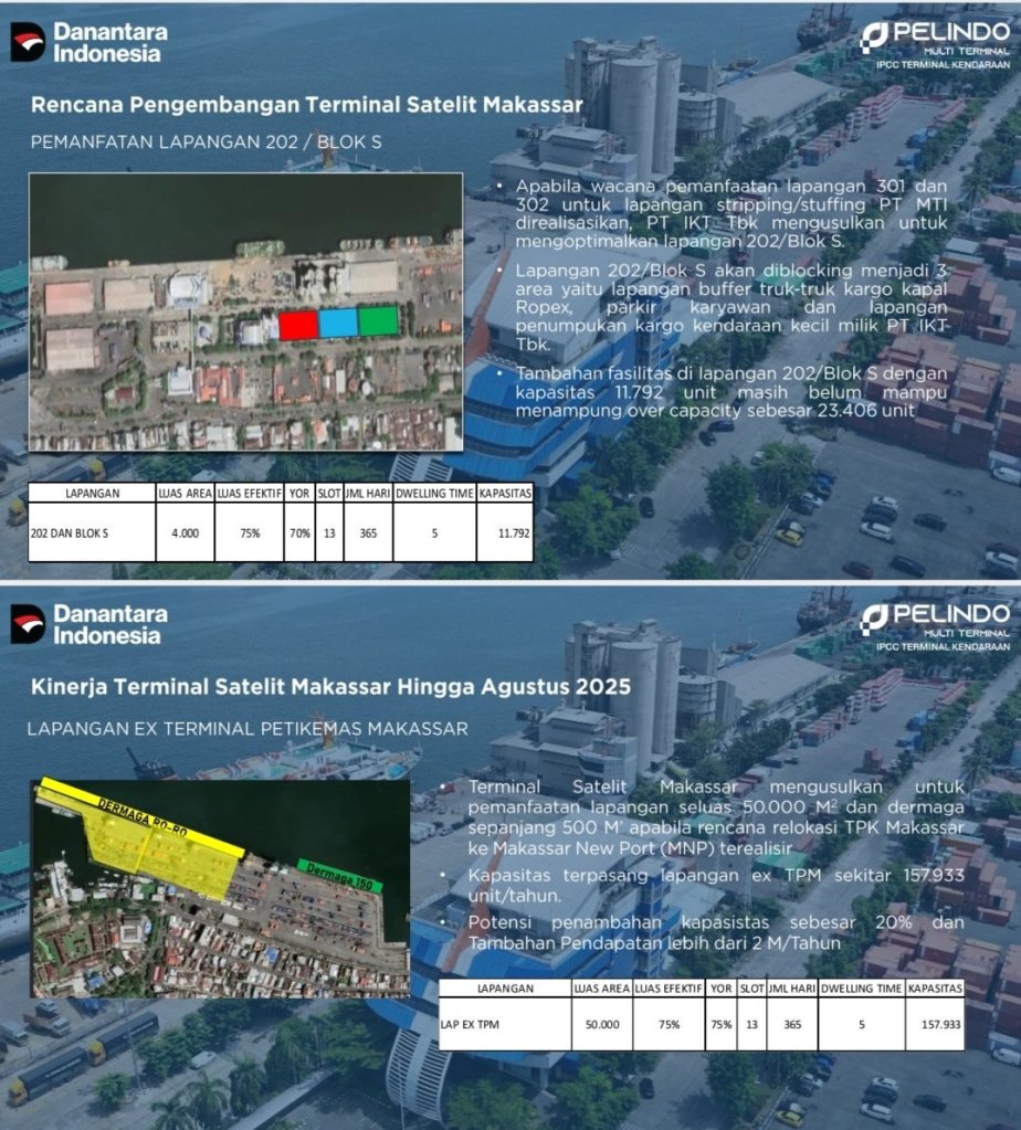 “Tak hanya soal lahan, IPCC Satelit Makassar juga ditopang fasilitas modern: dermaga khusus kapal Ro-Ro, gedung parkir tiga lantai berluas 10.807,5 m², serta lapangan penumpukan seluas 6.950 m² (Lapangan 103) dan 4.050 m² (Lapangan 301). Total kapasitas simultan mencapai 810 kendaraan, menjadikan terminal ini sanggup menangani arus volume tinggi sekitar 7.000 unit per bulan,” jelas Azhar.(Red-MM).